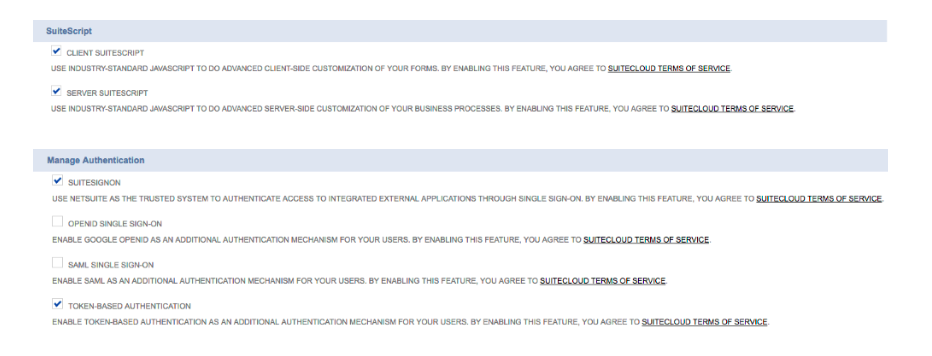 When on this page, make sure you go to the SuiteCloud tab and then check off four options that we need 'on' in order to sync data.