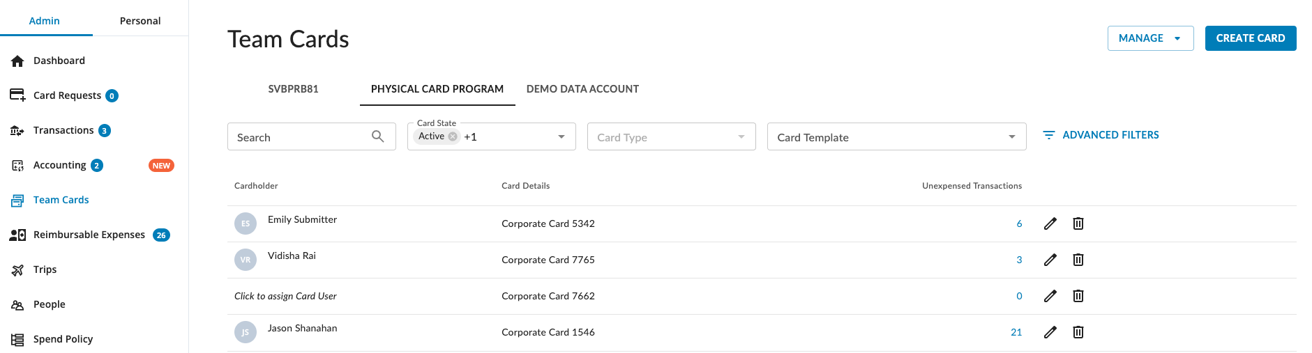 - Click the hyperlinked number under Unexpensed Transactions to open a filtered list of the unexpensed transactions associated with that card on the Transactions page (Please note: You have to assign the card to the user before you can see the Pending Submission transactions for that card).